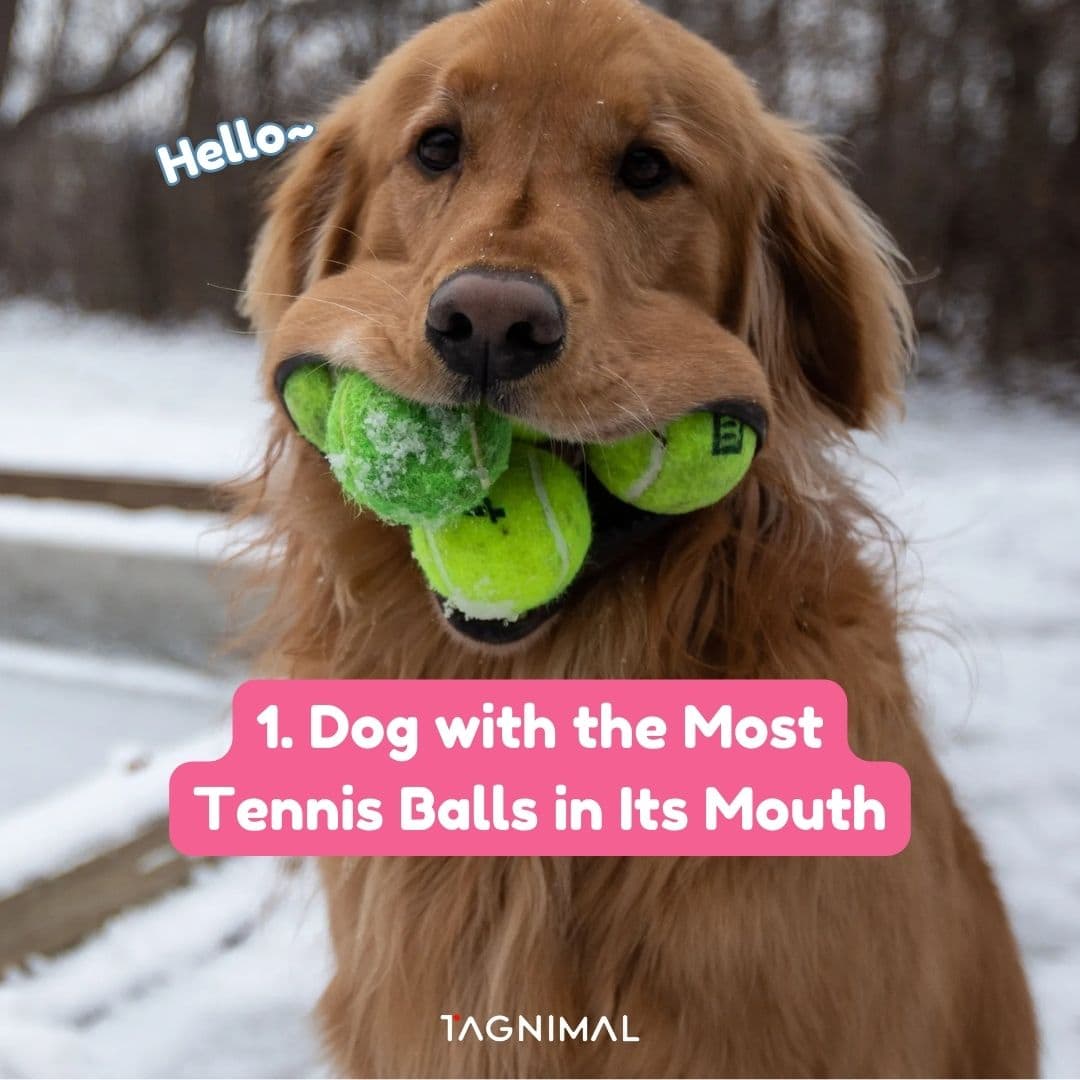 Finley, a Golden Retriever, holds the record for fitting six tennis balls in his mouth at once, showing remarkable control and a wide-open jaw span. This record was set in 2020.