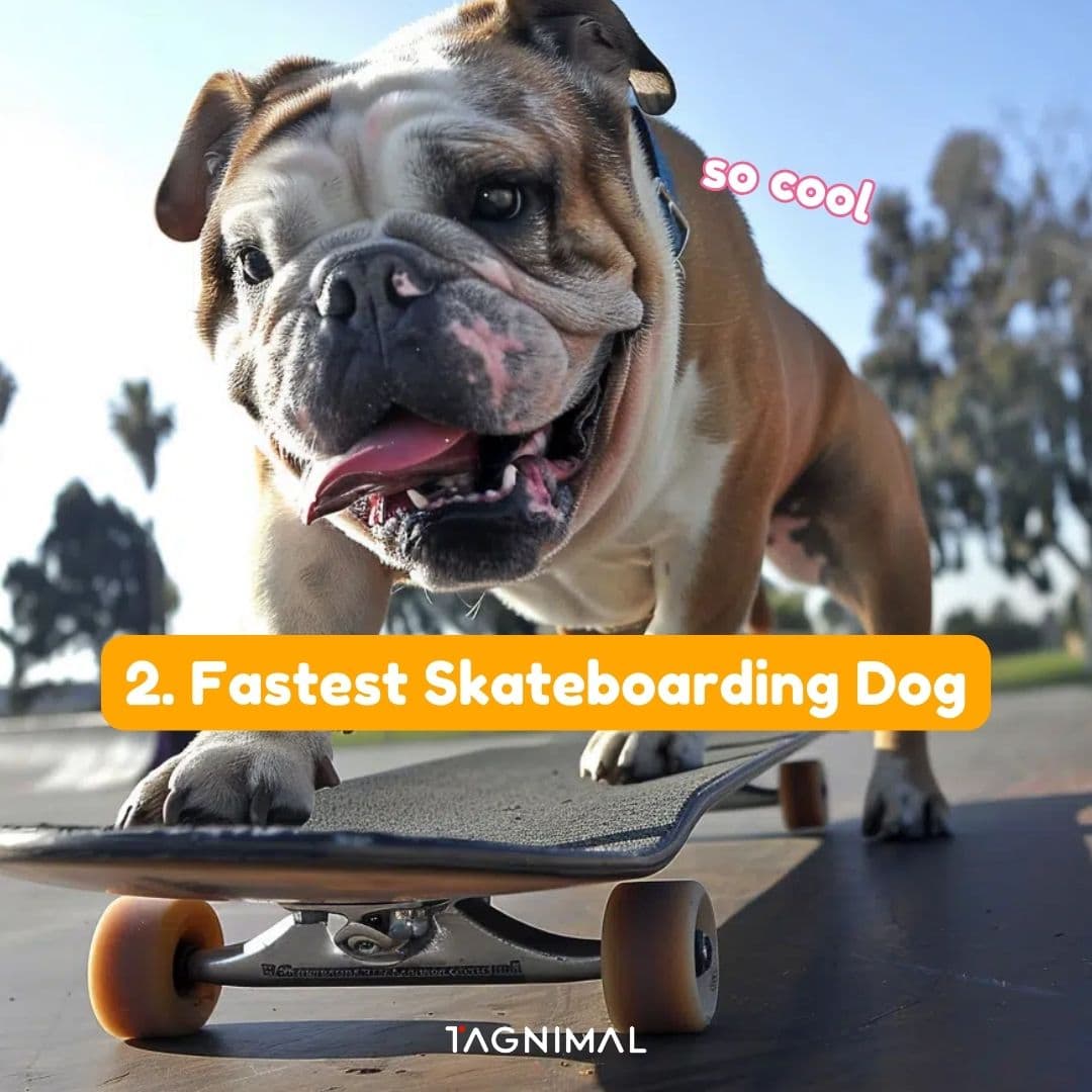 Otto, an English Bulldog, achieved the record for the fastest skateboarding by covering 30.2 meters in just 18.22 seconds while maneuvering around obstacles smoothly. This record was documented in 2015.