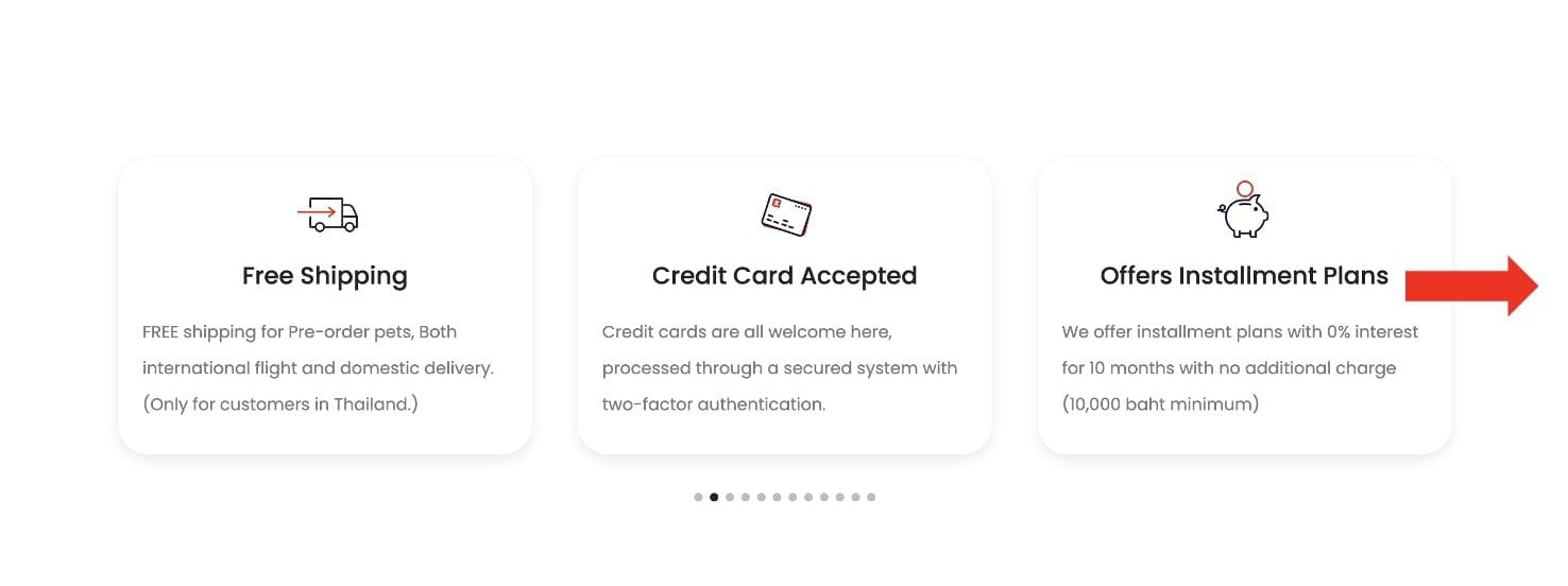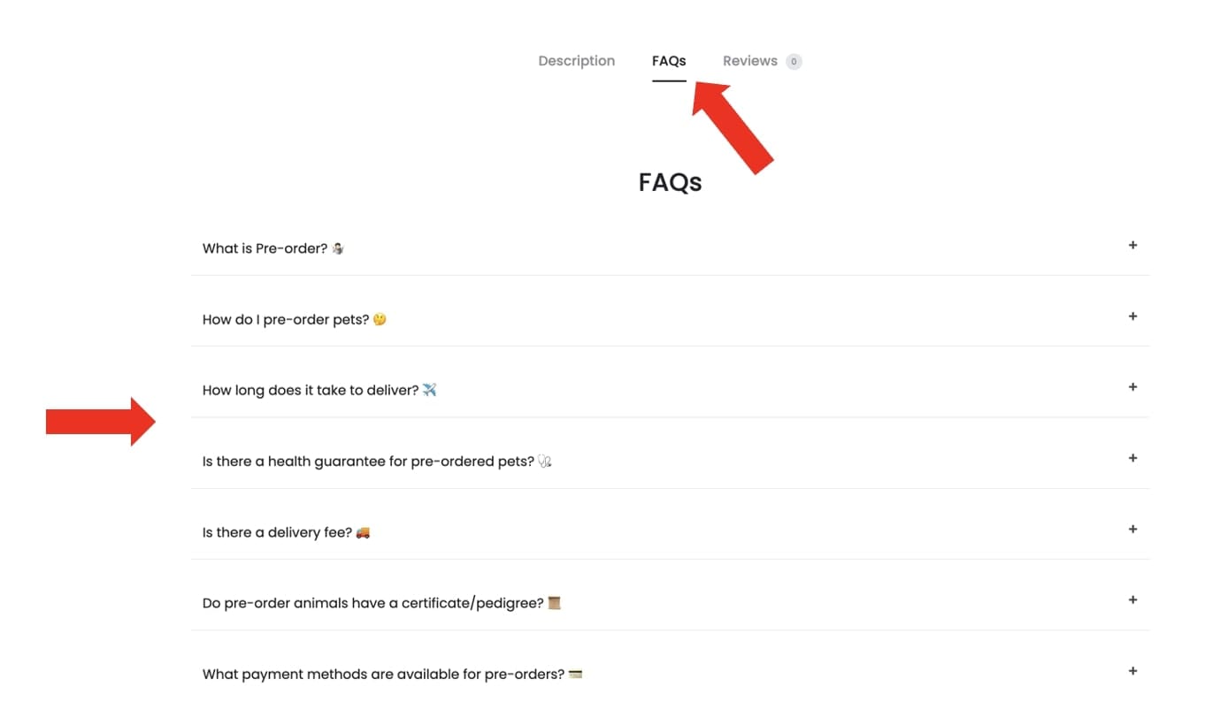 Also, if you scroll down, you will find detailed information about the puppy, such as birth date, gender, breed, and frequently asked questions. As well as the information card that we have to show what services we provide to our customers.