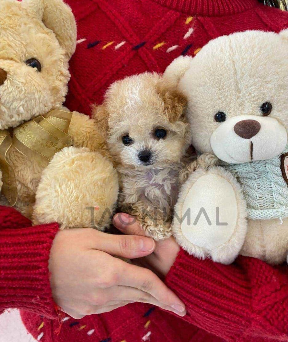 The little Korean Maltipoo baby female Teacup with super fluffy Parti color fur and unique vivid markings around her paws and ready for a new loving home ❤️