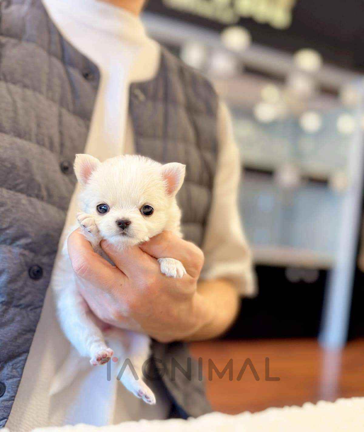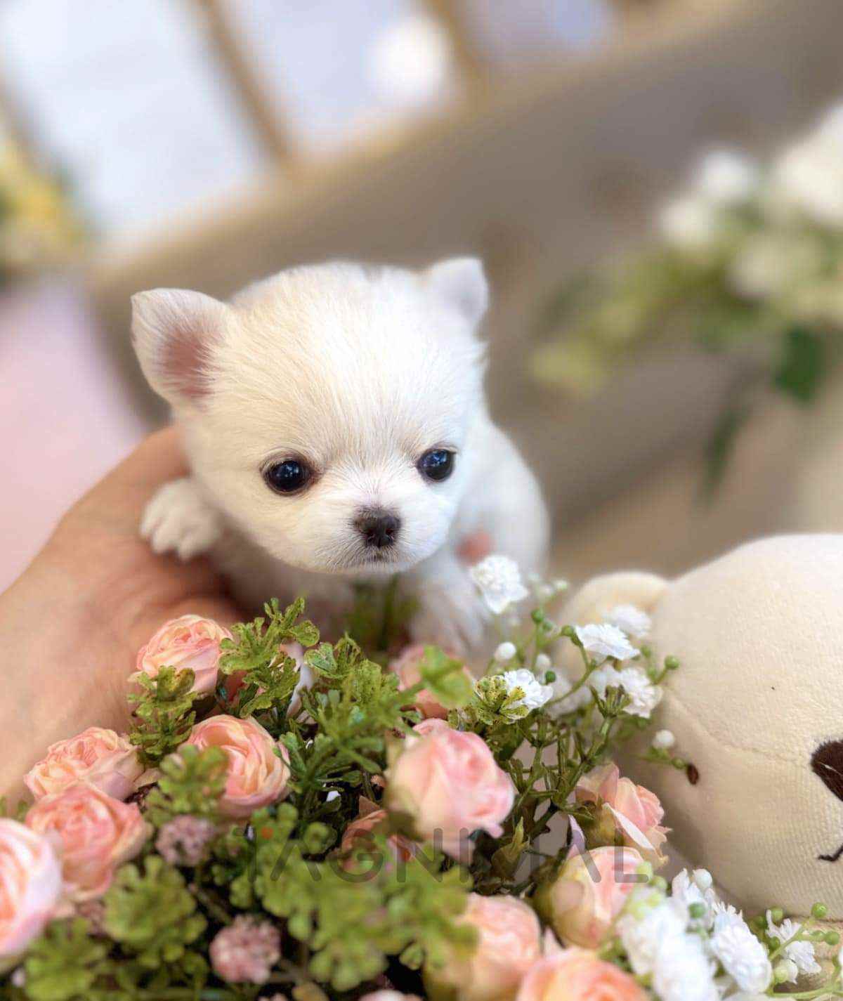 The little Korean Chihuahua baby girl with Longhair fur, super fancy white color, perfect markings and cute Teacup size is now ready for a new loving home ❤️