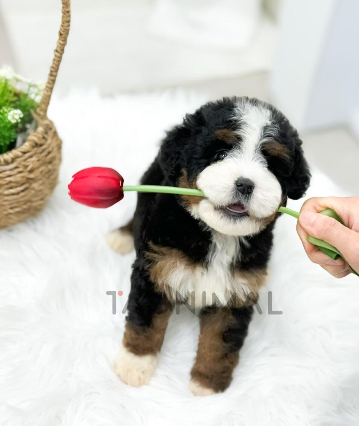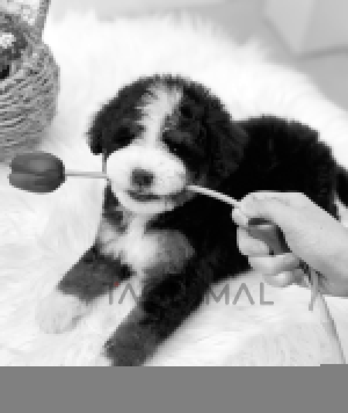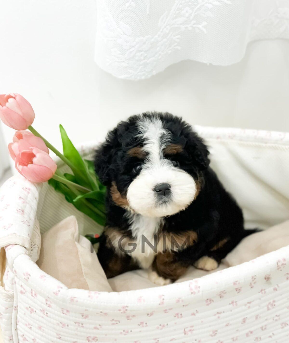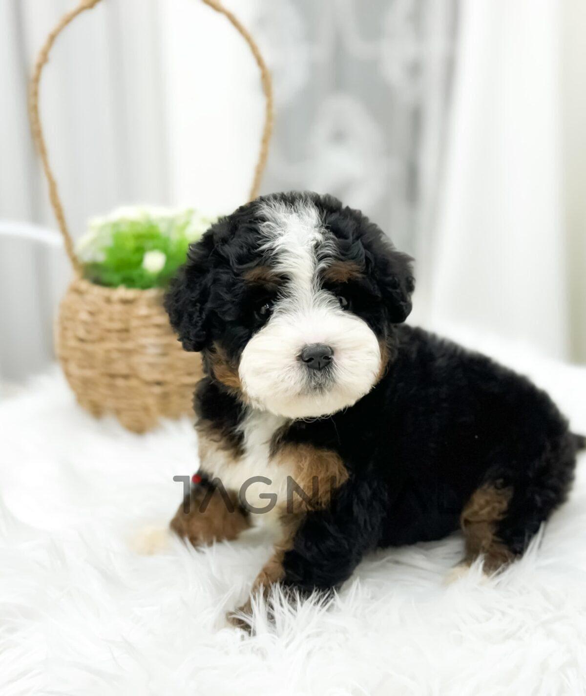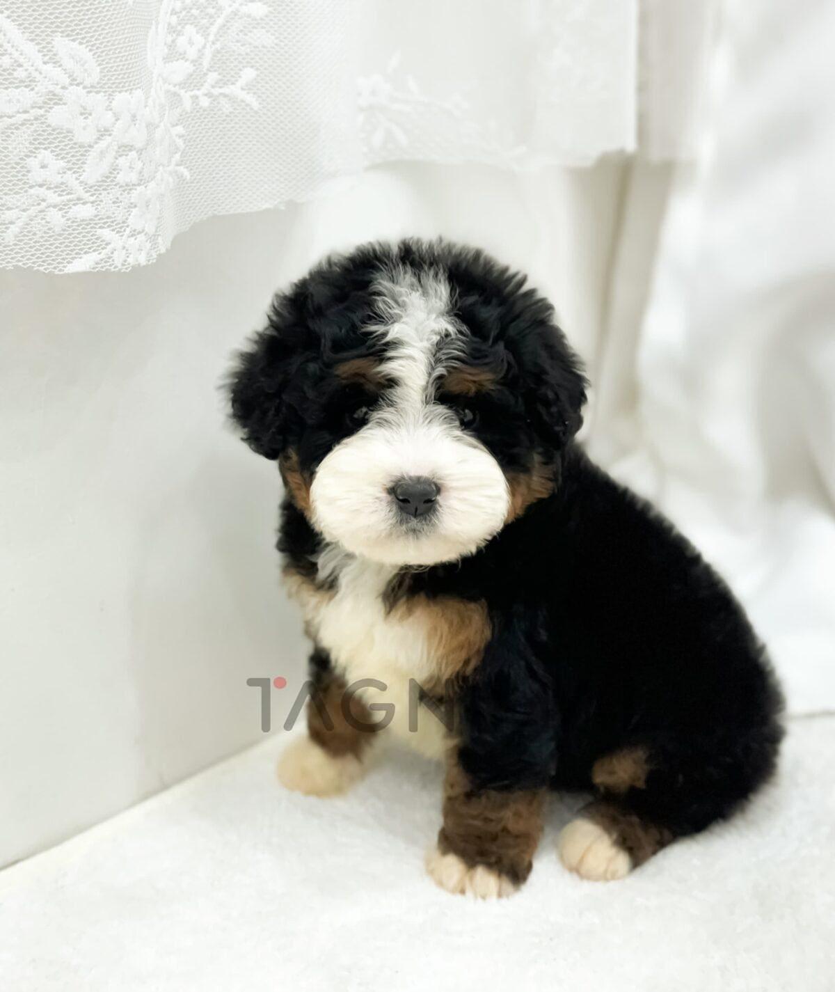 The little Korean Bernedoodle baby boy with the hybrid breed, adorable face, Beautiful curly white black and brown fur, and the perfect size for cuddling is now ready for a new loving home ❤️