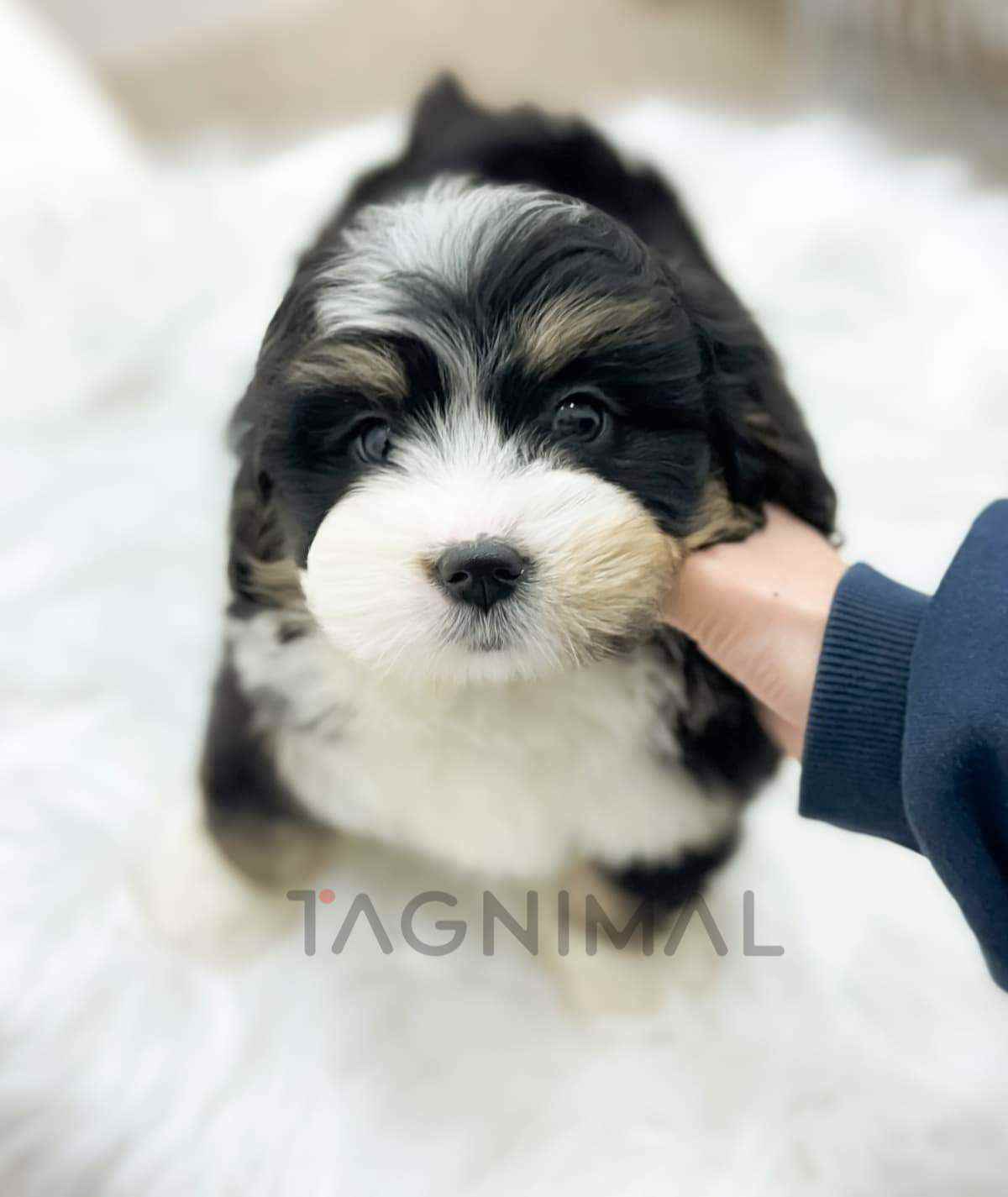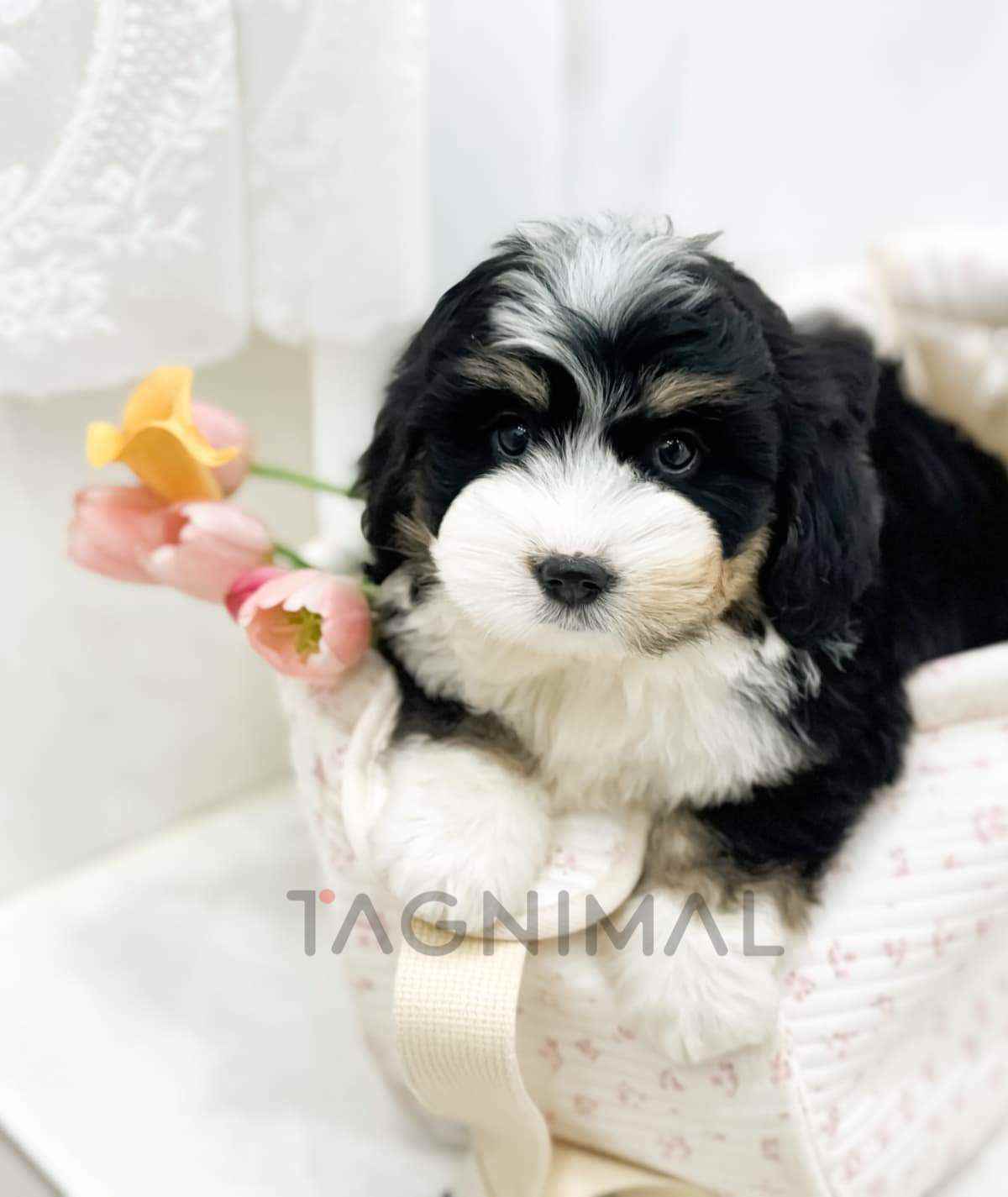 The little Korean Bernedoodle baby boy with the hybrid breed, adorable face, Beautiful curly white black and brown fur, and the perfect size for cuddling is now ready for a new loving home ❤️
