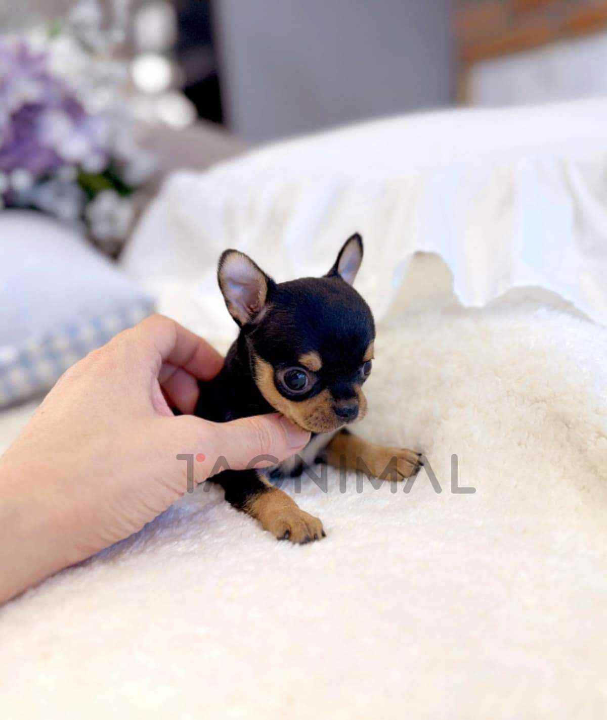 The little Korean Chihuahua longhair baby girl with super fancy chocolate fur, vivid perfect markings, and super tiny Teacup size is now ready for a new loving home ❤️