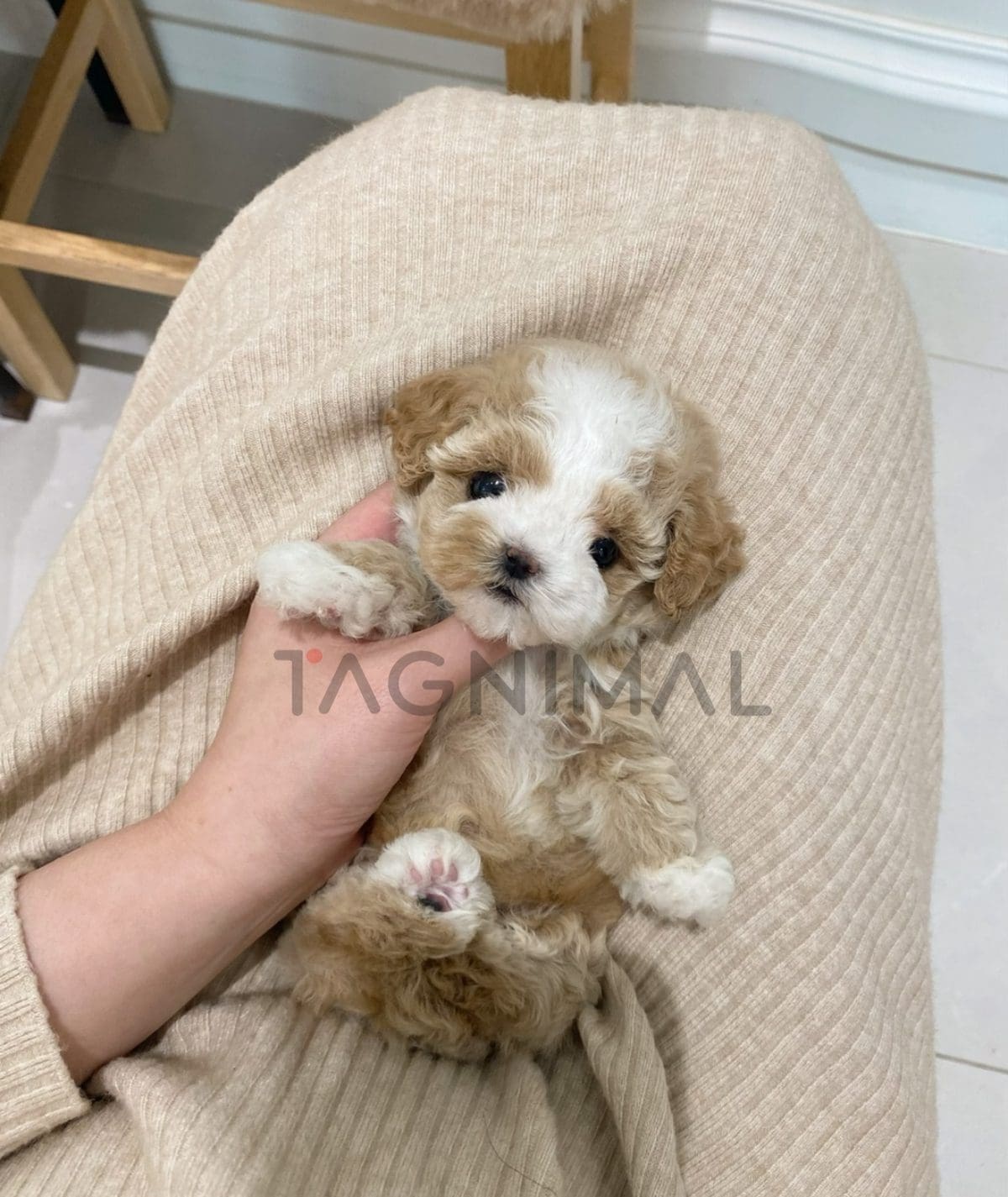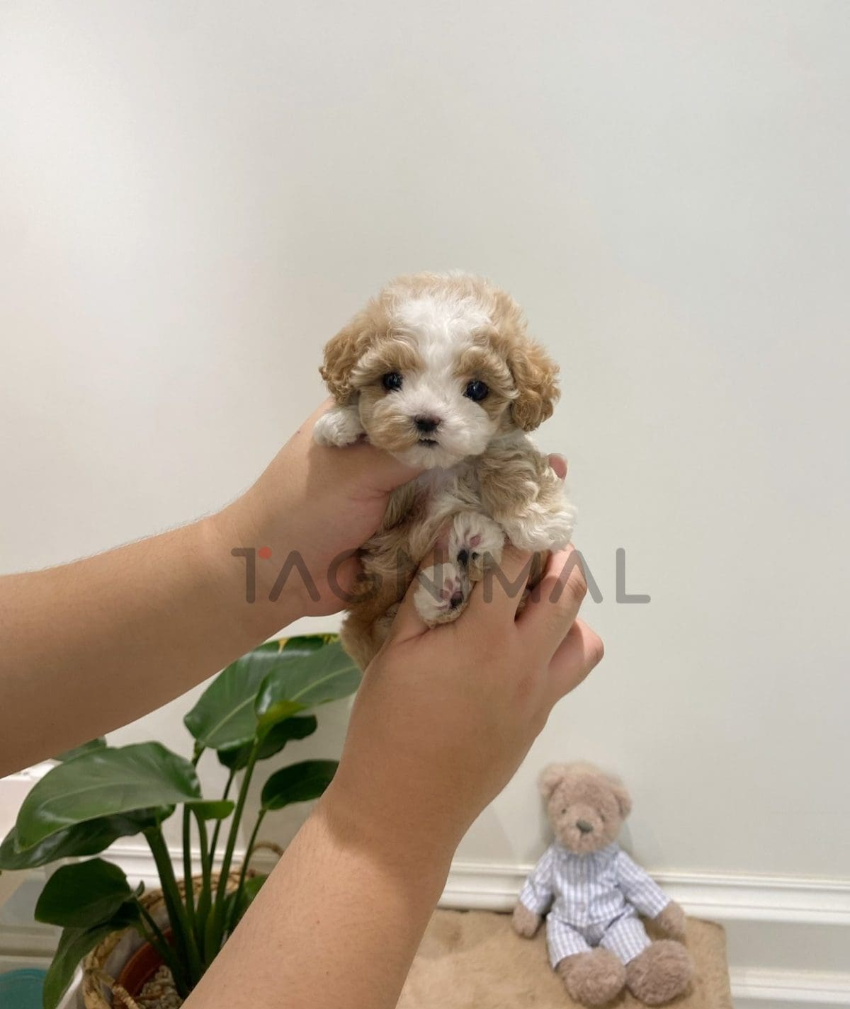 🇰🇷 IMPORT FROM SOUTH KOREA 🇰🇷 The little Korean Maltipoo baby boy with super fluffy Parti color fur and unique vivid markings around his head and ready for a new loving home ❤️