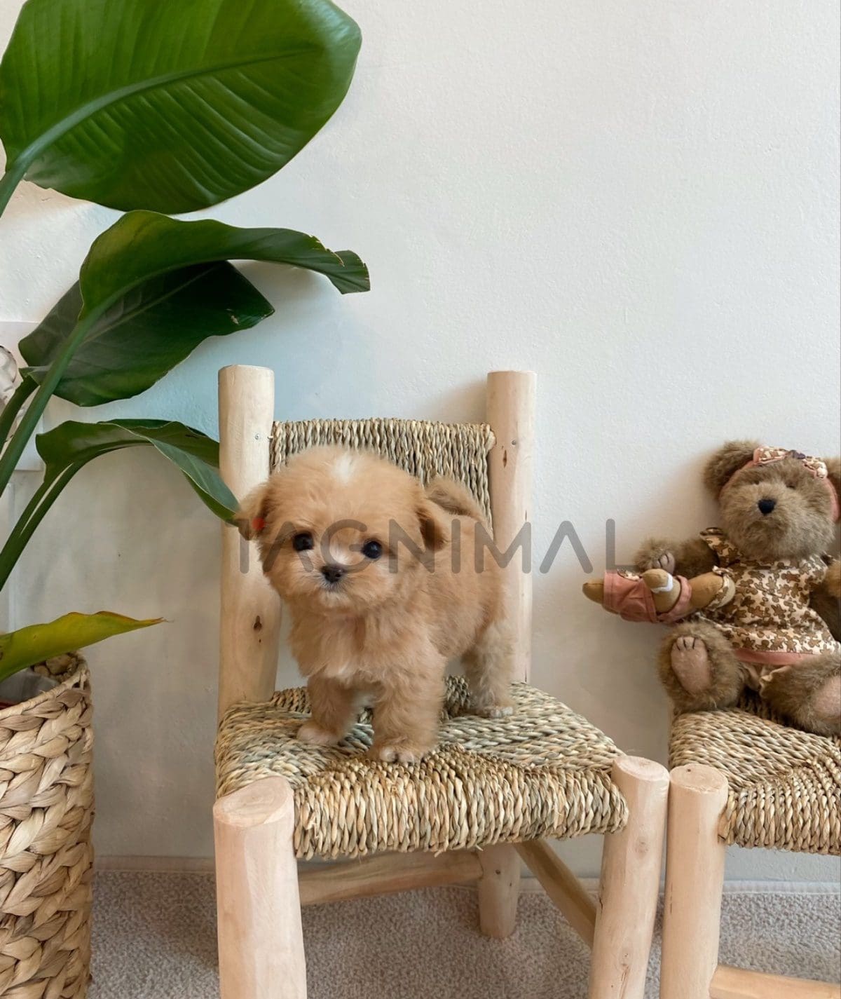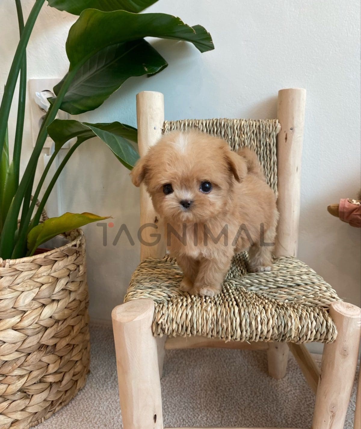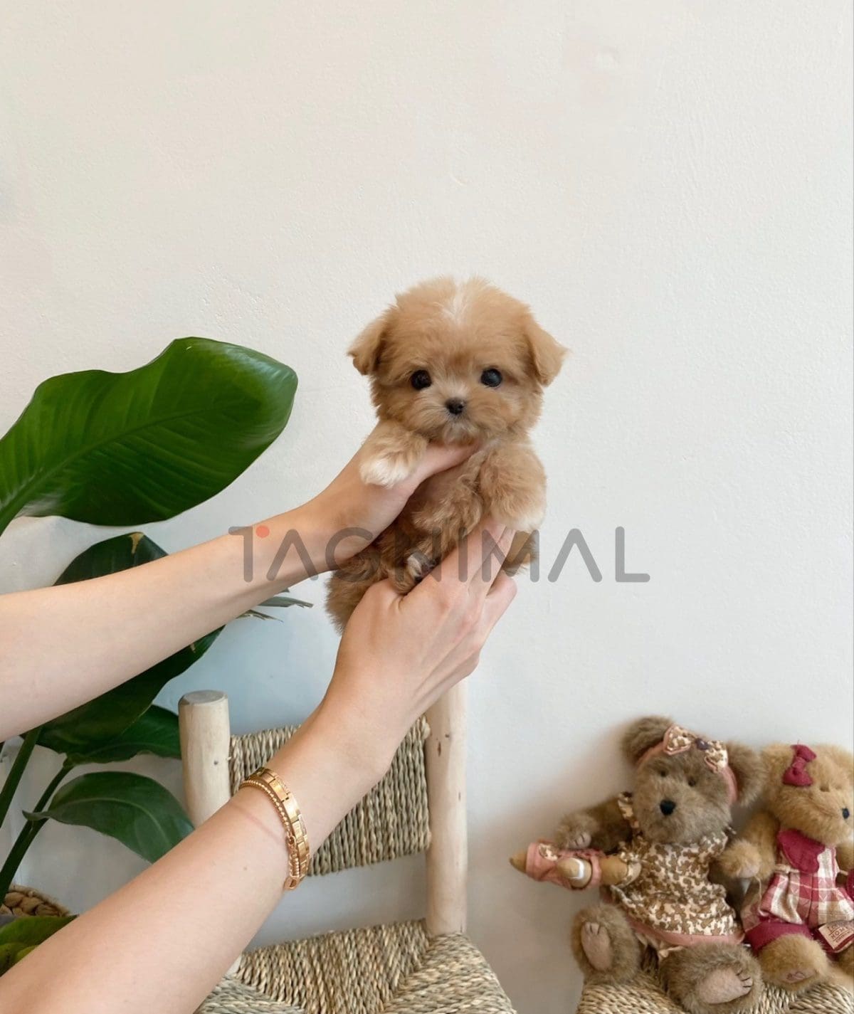 The little Korean Maltipoo baby male mini with super fluffy Parti color fur and unique vivid markings around his paws and ready for a new loving home ❤️