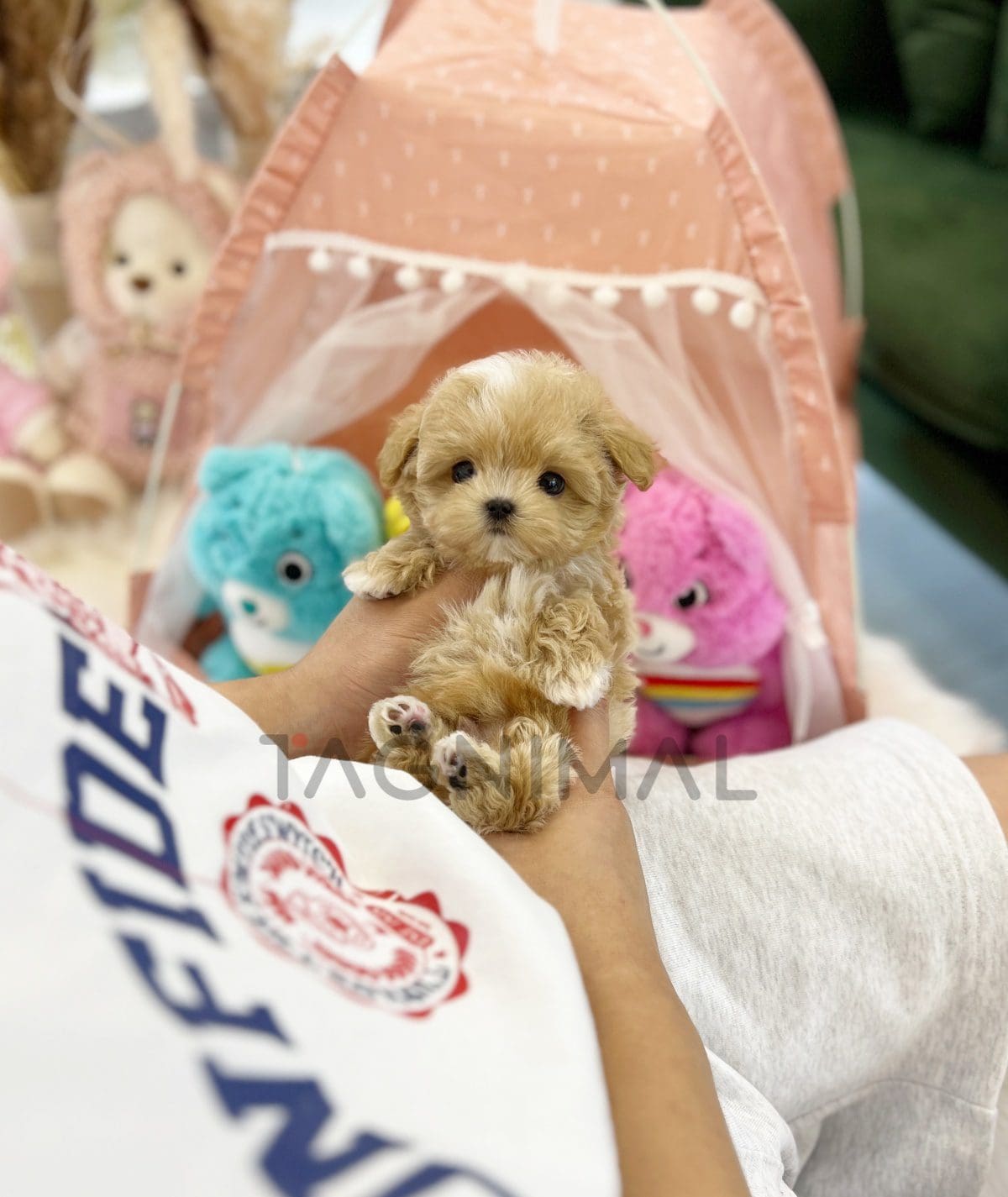 The little Korean Maltipoo baby male mini with super fluffy Parti color fur and unique vivid markings around his paws and ready for a new loving home ❤️