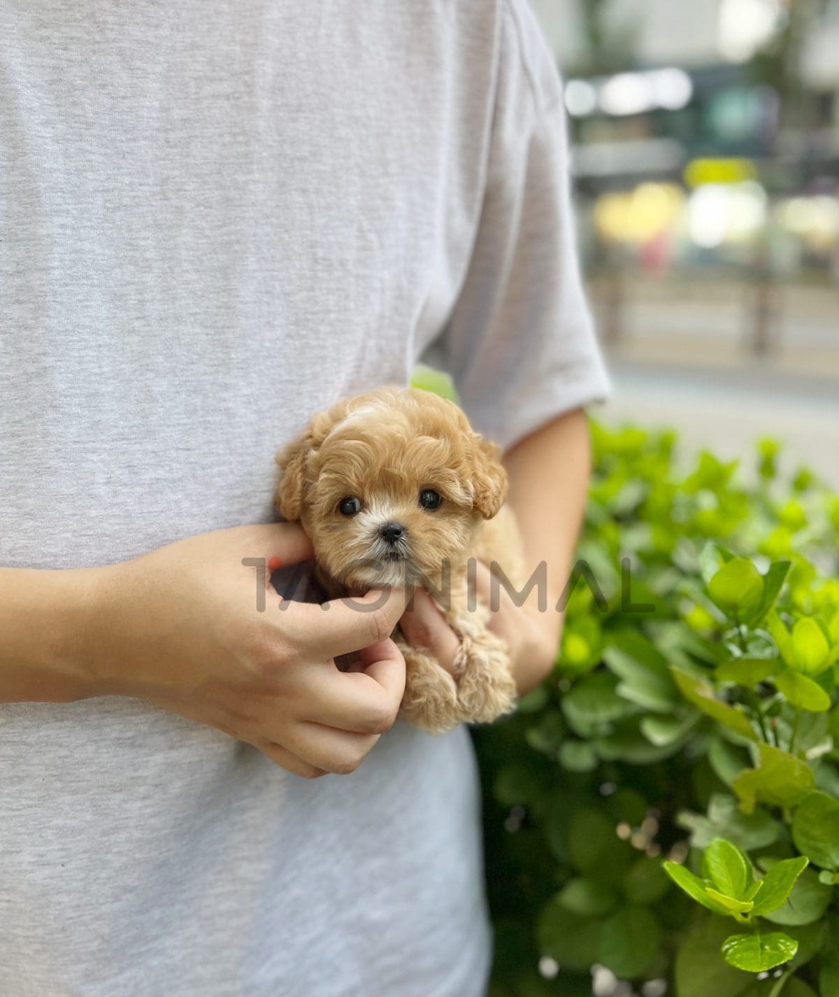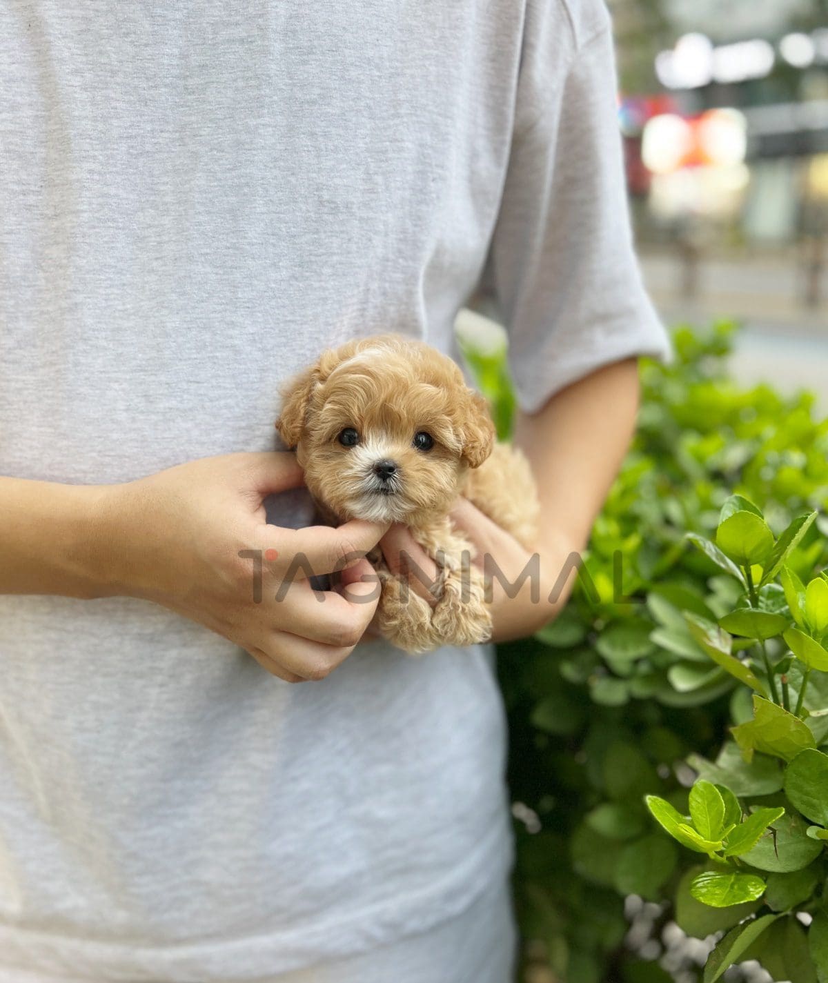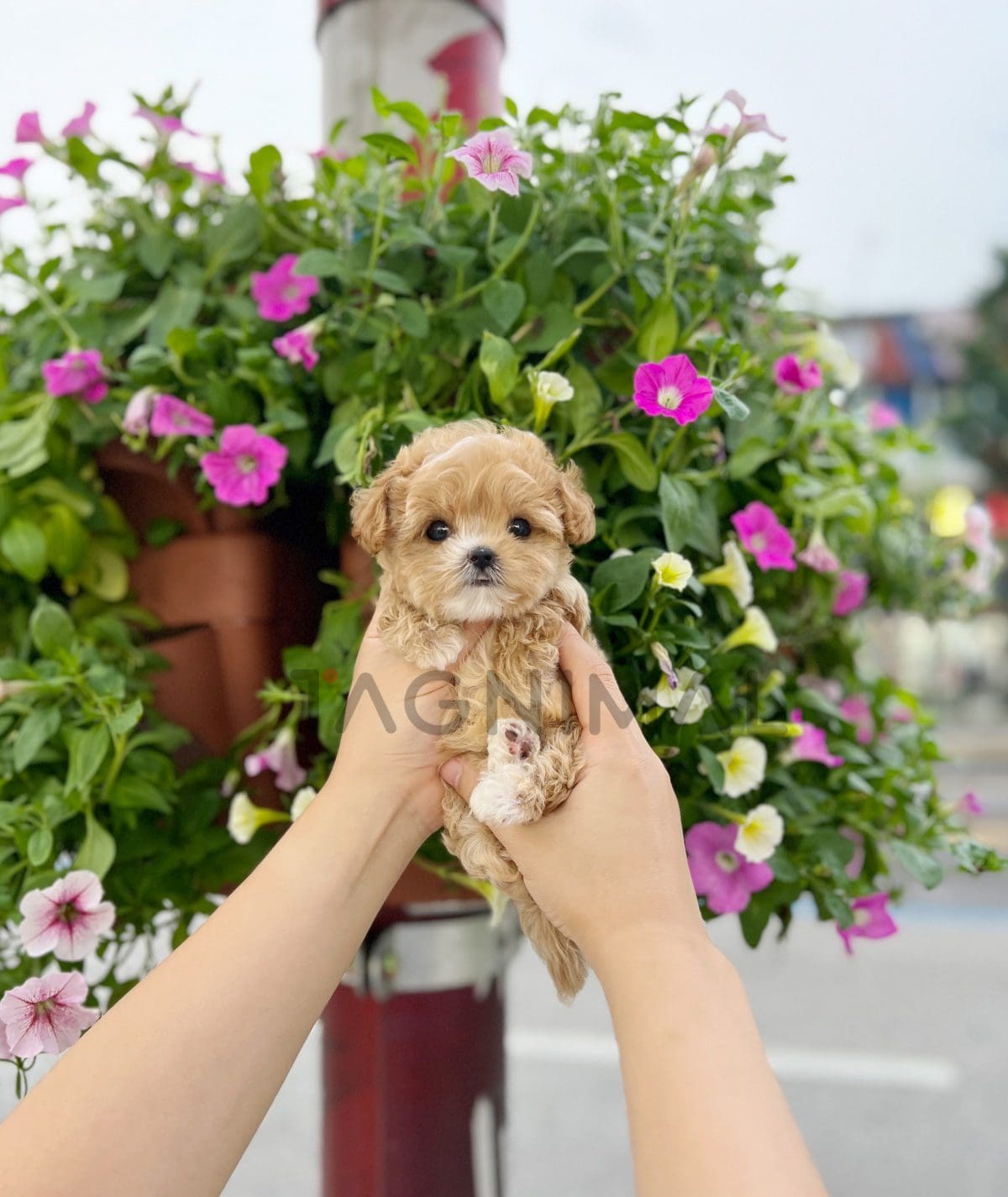 The little Korean Maltipoo baby male mini with super fluffy Parti color fur and unique vivid markings around his paws and ready for a new loving home ❤️